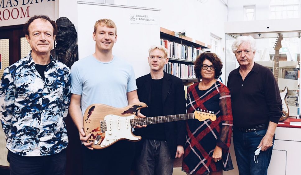 Kevin Herron of emerging Irish band Rowan was presented with the stunning prize at a ceremony in Cork’s Rory Gallagher Music Library today. Pictured from L–R: Niall Stokes, Kevin Herron, Eoin Gallagher, Helen McGonagle (executive librarian of the Rory Gallagher Music Library in Cork) and Dónal Gallagher.